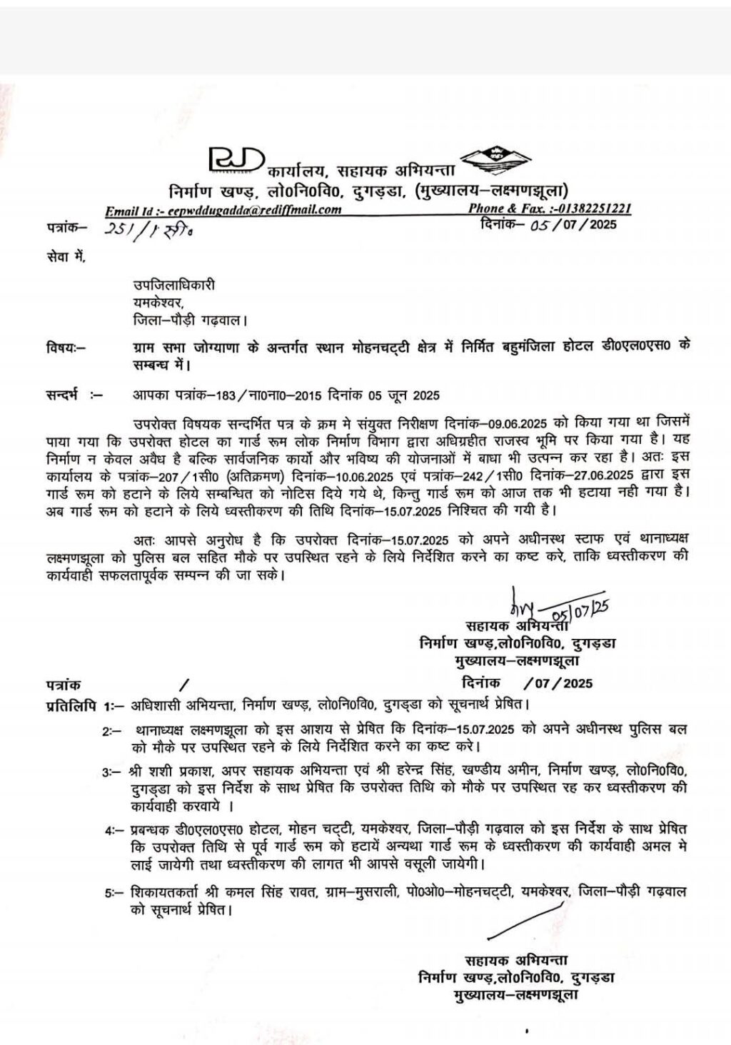 यमकेश्वर। सुदीप कपरूवान। 12 जुलाई 2025। तहसील जाखनी खाल के जोग्याना मोहन चट्टी क्षेत्र में राजस्व भूमि पर निर्मित बहुमंजिला होटल डीएलएस के गार्ड रूम को... Read More