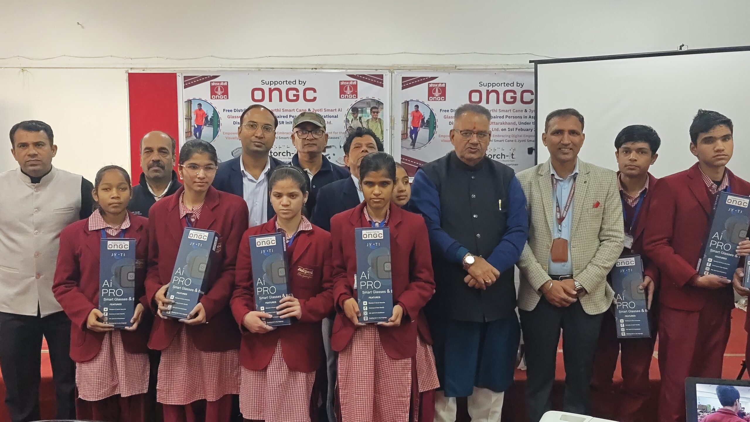 इस डिवाइस का वितरण गुजरात की एक कंपनी टॉर्च इट के द्वारा किया गया। टॉर्च किट के फाउंडर मिस्टर हनी भग्लानि जी एवं ओएनजीसी के सीएसआर हेड अरुण सिंह के द्वारा इस डिवाइस को आदर्श विद्यालय के छात्र एवं छात्राओं हेतु उपलब्ध कराया गया। इस अवसर पर 120 ज्योति आई ग्लास दिव्यांग छात्र एवं छात्राओं को प्रदान किए गए और 190 सारथी स्मार्ट केन छात्र एवं छात्राओं को वितरित किए गए। यह एक ऐसी डिवाइस है जो की 80 से अधिक भाषाओं को ट्रांसलेट कर सकती है। इस डिवाइस के द्वारा दृष्टि दिव्यांग छात्र कलर और 300 विभिन्न प्रकार के ऑब्जेक्ट भी पहचान पाएंगे। इस डिवाइस के द्वारा प्रिंट में लिखा हुआ मटेरियल दृष्टि दिव्यांग अपने मोबाइल के दद्वारा पढ़ पाएंगे। इस डिवाइस में जीके के क्वेश्चन भी दिए गए हैं। यह डिवाइस छात्र एवं छात्राओं को उनके शैक्षणिक कार्यों में सपोर्ट हेतु और उनके सशक्तिकरण हेतु महत्वपूर्ण रोल निभाएगी।